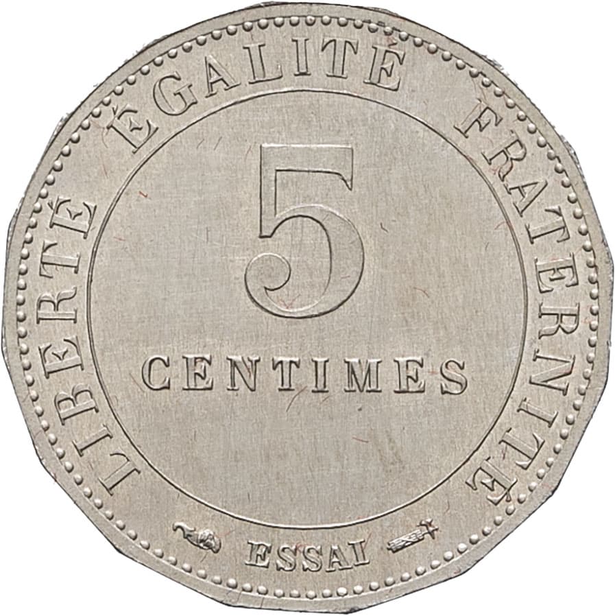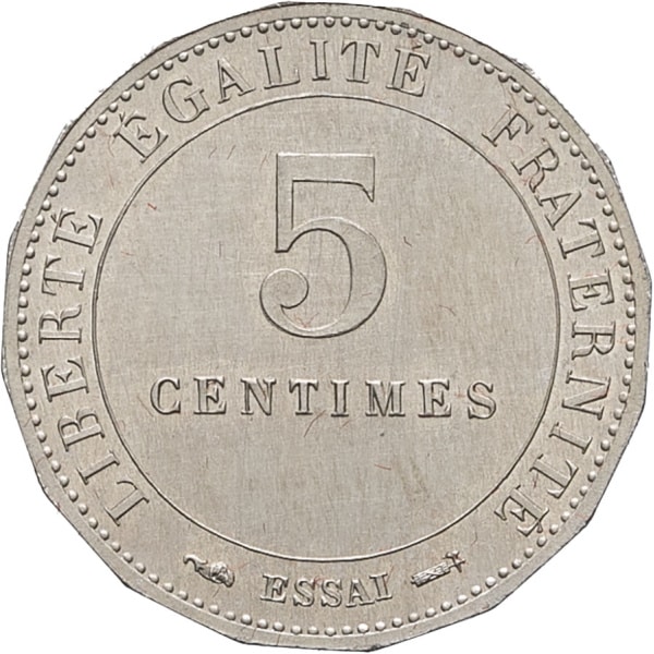 - IIIe République (1870-1940). Essai de 5 centimes Merley, 2e type, flan à 16 pans, sans lettre d’atelier 1887, Paris.