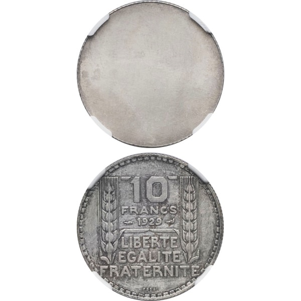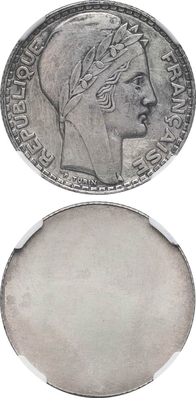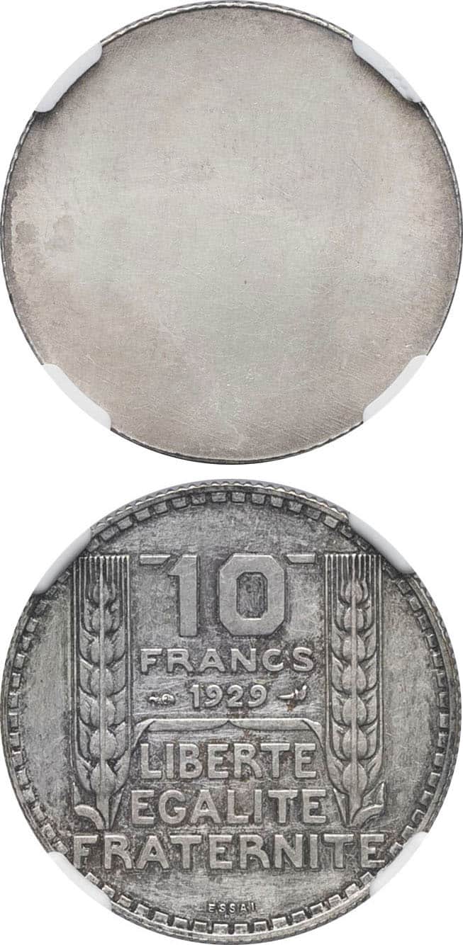 - IIIe République (1870-1940). Paire d’essais unifaces de 10 francs Turin, en cupro-aluminium argenté, avers et revers 1929, Paris.