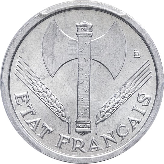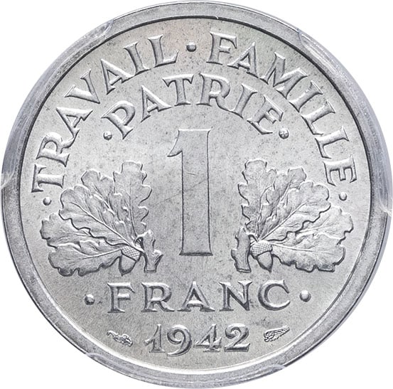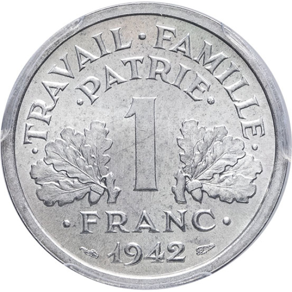- État Français (1940-1944). Présérie de 1 franc Bazor, avec croix sur les besants autour de PATRIE, Frappe spéciale (SP) 1942, Paris.