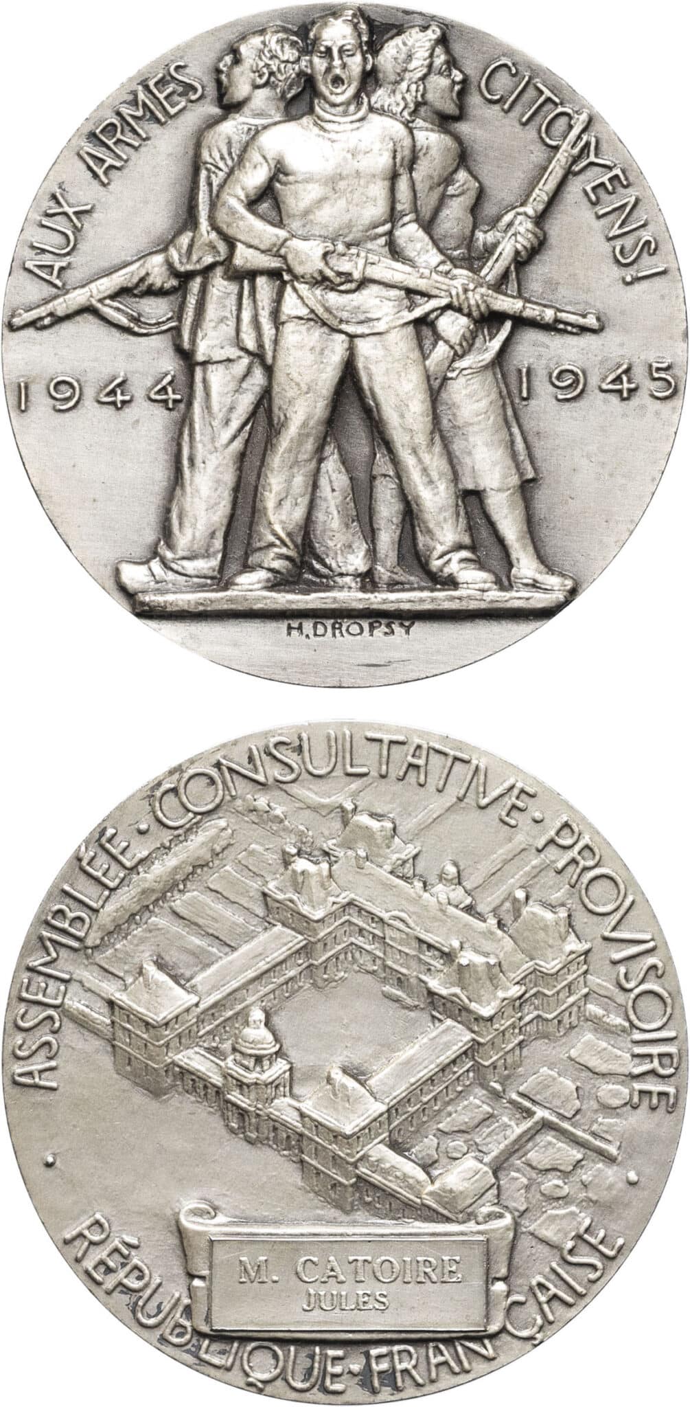 - Gouvernement provisoire de la République française (1944-1946). Médaille d’identité de l’Assemblée consultative provisoire, par H. Dropsy 1944, Paris.