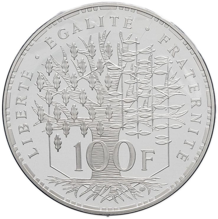 Rv. LIBERTE. EGALITE. FRATERNITE. Arbre formé d’une moitié de chêne et d’une moitié d’olivier, sur un hexagone. Sur le tronc : 100 F.
