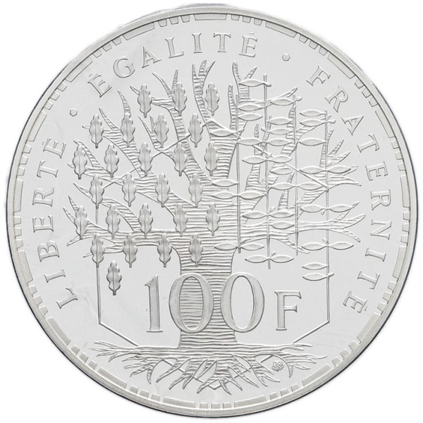 Rv. LIBERTE. EGALITE. FRATERNITE. Arbre formé d’une moitié de chêne et d’une moitié d’olivier, sur un hexagone. Sur le tronc : 100 F.
