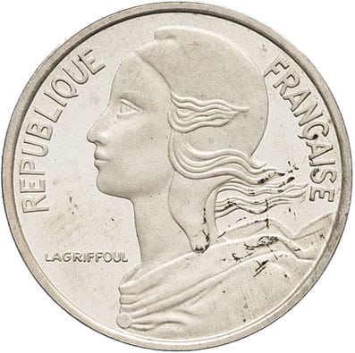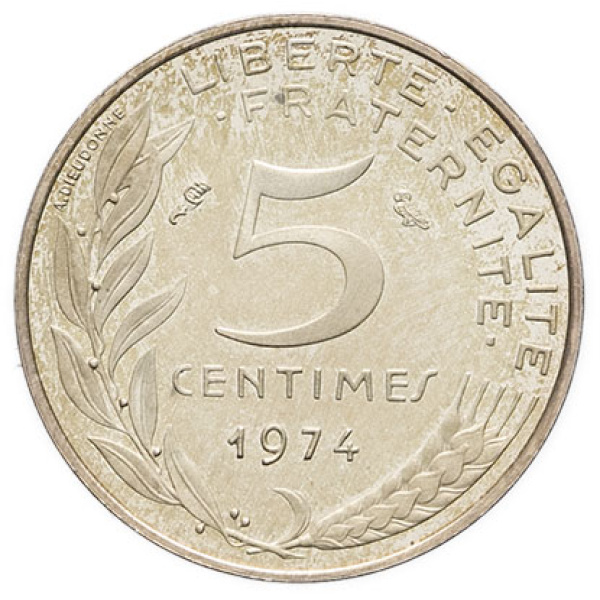 - Ve République (1958 à nos jours). Piéfort de 5 centimes Marianne en argent 1974, Paris.