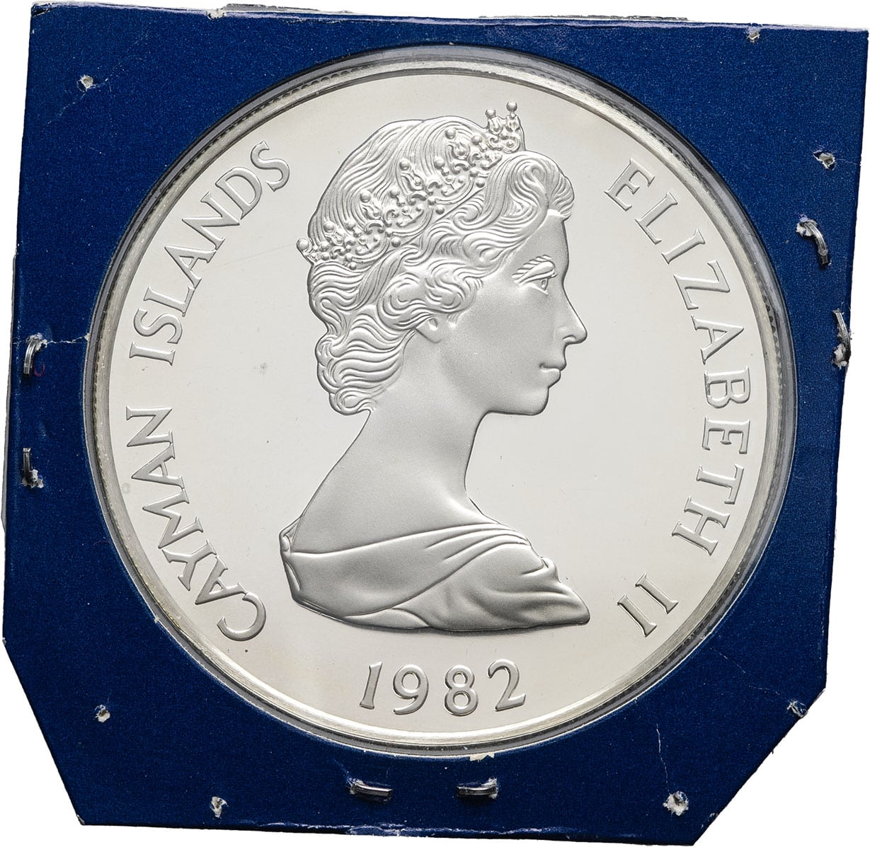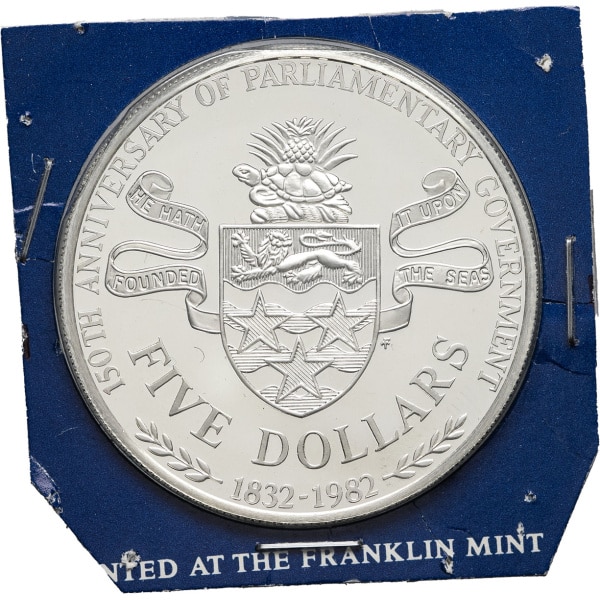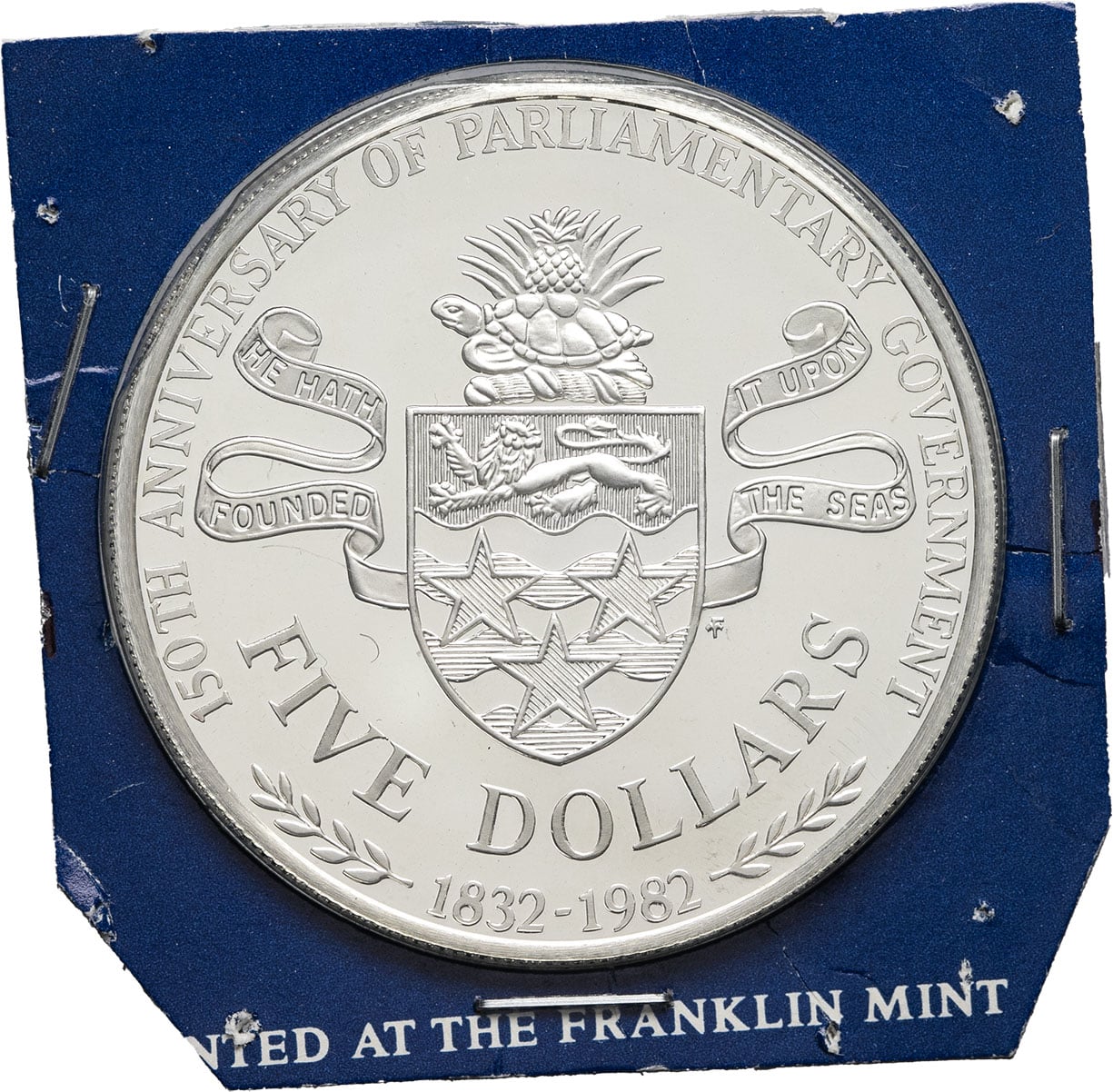 - CAYMAN ISLANDS Élisabeth II (1952-2022). 5 dollars, 150e anniversaire du gouvernement parlementaire, frappe sur Flan bruni (PROOF) 1982, FM, Franklin mint.