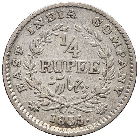 - BRITISH INDIES Guillaume IV (1830-1837). 1/4 roupie 1835, Bombay.