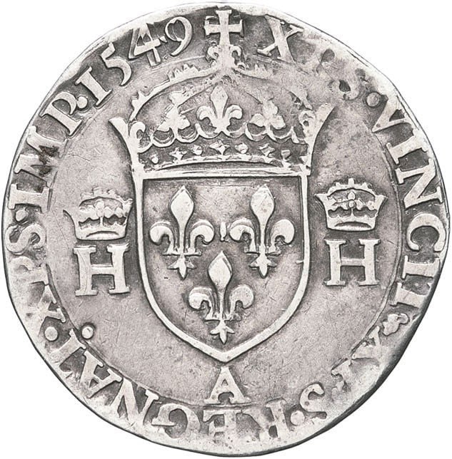 Rv. + XPS. VINCIT. XPS. REGNAT. XPS. IMPE. (date) (différent). Écu de France couronné entre deux H couronnées, (atelier) à la pointe de l’écu.
