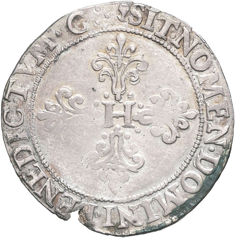Rv. (différent). SIT. NOMEN. DOMINI. BENEDICTVM. (différent). Croix feuillue et fleurdelisée, avec H en cœur.