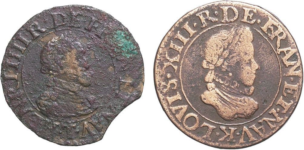 Celui d’Henri IV clippé, avec un point de vert de gris, corrodé. TB. Celui de Louis XIII nettoyé. TB.