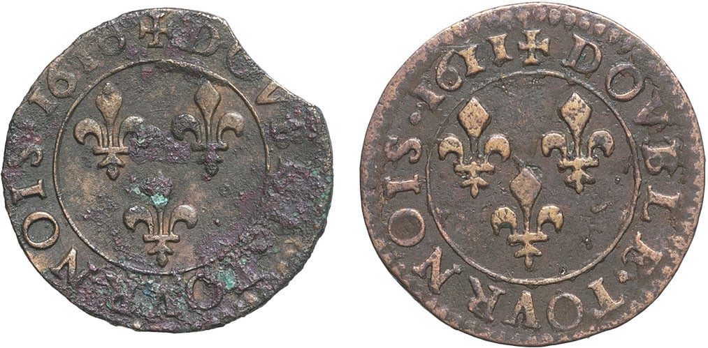 - FRANCE / ROYAL Lot. Lot de 2 doubles tournois 1610, T, Nantes et 1611, K, Bordeaux.