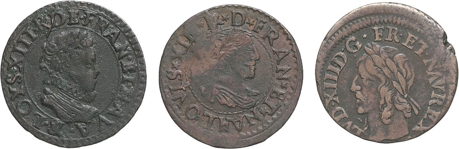 - FRANCE / ROYAL Louis XIII (1610-1643). Lot de 3 doubles tournois 1613, &, Aix-en-Provence, 1640, H, La Rochelle et 1643, A, Paris.