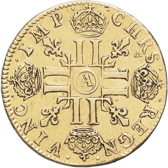 Rv. .CHRS. - .REGN. - .VINC. - .IMP. Croix formée de huit L adossées, chaque bras étant couronné, avec (atelier) dans un cercle en cœur, cantonnée de quatre lis divergeant du centre.