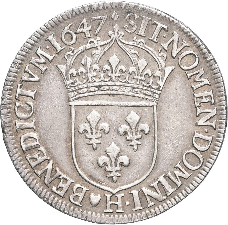 - FRANCE / ROYAL Louis XIV (1643-1715). Écu à la mèche longue 1647, H, La Rochelle.