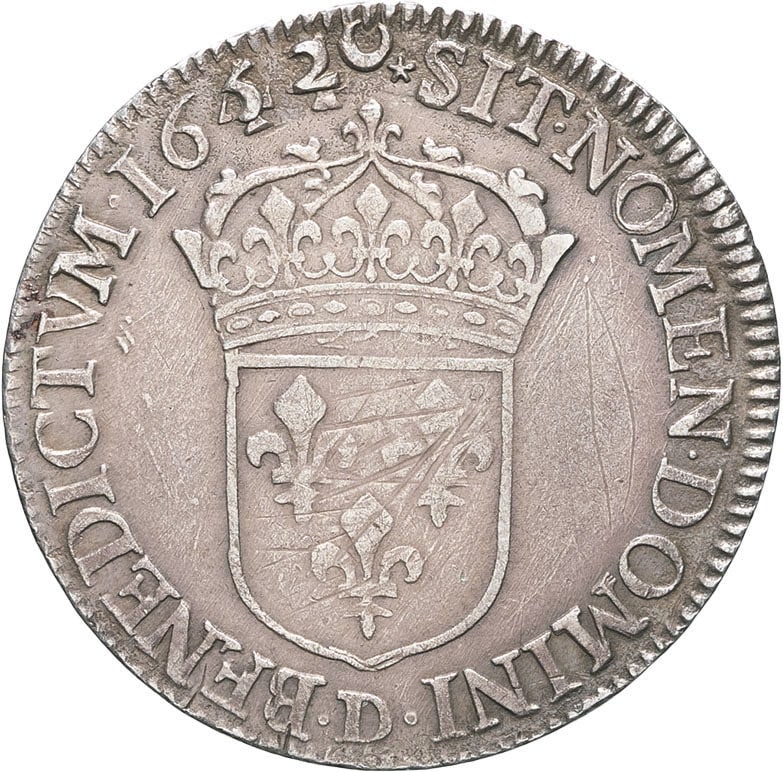 Rv. (différent). SIT. NOMEN. DOMINI. BENEDICTVM (différent) (date). Écu de France couronné, au-dessous (atelier).