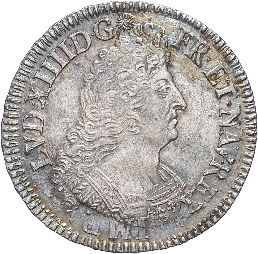 Av. LVD. XIIII. D. G (soleil) - FR. ET. NAV. REX. Buste à droite du Roi, cuirassé à l’antique.