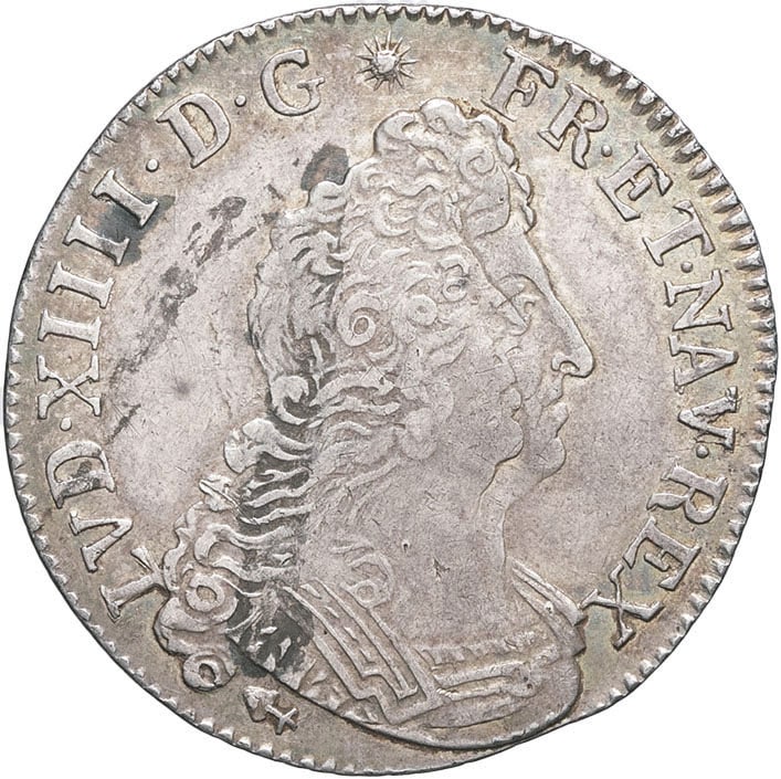 Av. LVD. XIIII. D. G (soleil) - FR. ET. NAV. REX. Buste à droite du Roi, cuirassé à l’antique.