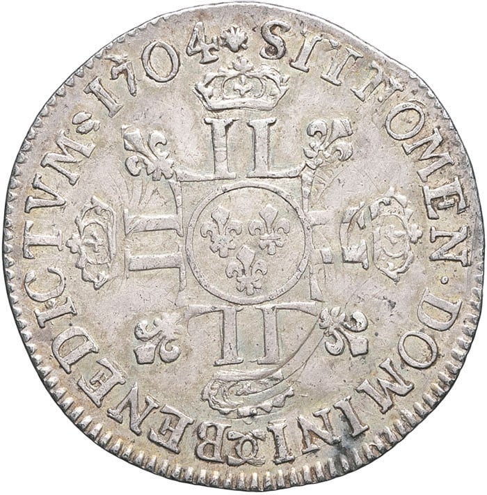 Rv. (différent) SIT. NOMEN. DOMINI. BENEDICTVM (différent) (date). Croix formée de huit L adossées, chaque bras étant couronné, avec trois lis posés 2 et 1 dans un cercle en cœur, cantonnée de quatre lis divergeant du centre ; à l’exergue (atelier).
