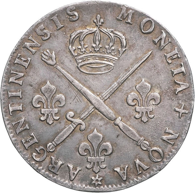 Av. MONETA (différent) NOVA (différent) ARGENTINENSIS. Main de justice et glaive, posés en sautoir, sous une couronne, accostés de trois lis posés 2 et 1.