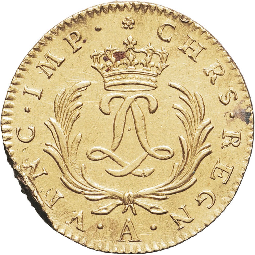 Rv. (différent) CHRS. REGN. - .VINC. IMP. Deux L cursives entrelacées, sous une couronne, entre deux palmes. Au-dessous (atelier).