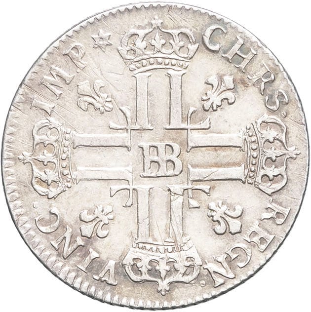 Rv. CHRS. - REGN. - VINC. - IMP (différent). Croix formée de huit L adossées, chaque bras étant couronné, (atelier) en cœur, cantonnée de quatre lis divergeant du centre.