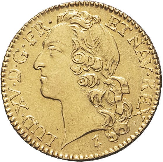 Av. LVD. XV. D. G. FR. ET. NAV. REX. Tête à gauche du Roi, ceinte d’un bandeau, au-dessous (différent).
