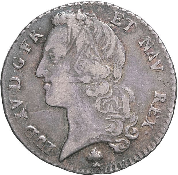 Av. LUD. XV. D. G. FR. ET NAV. REX. Tête à gauche du Roi, ceinte d’un bandeau, signature JCR en monogramme sur le cou ; au-dessous (différent).