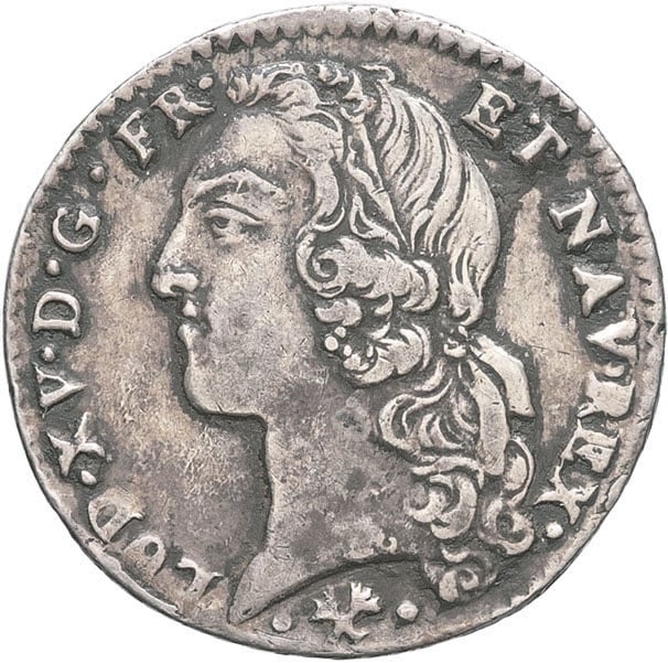 Av. LUD. XV. D. G. FR. ET NAV. REX. Tête à gauche du Roi, ceinte d’un bandeau, signature JCR en monogramme sur le cou ; au-dessous (différent).