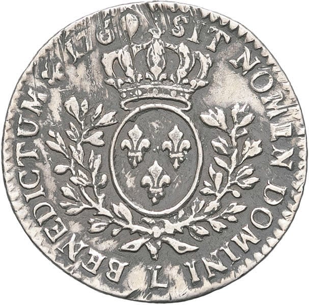Rv. SIT. NOMEN. DOMINI. BENEDICTUM (différent) (date). Écu de France ovale, couronné, entre deux rameaux d’olivier, au-dessous (atelier).