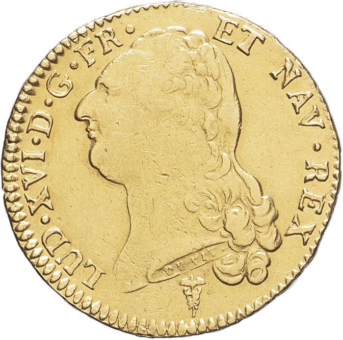 Av. LUD. XVI. D. G. FR. - ET NAV. REX. Tête nue du Roi à gauche. Signature DUVIV sur la tranche du cou ; au-dessous (différent).