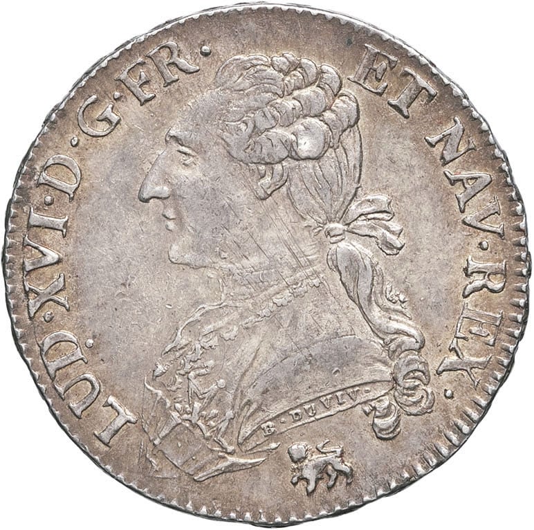 Av. LUD. XVI. D. G. FR. ET NAV. REX. Buste du Roi à gauche, portant une veste brodée, avec l’ordre du Saint-Esprit, les cheveux noués sur la nuque par un ruban. Signature B. DUVIV. F. sur la tranche du buste ; au-dessous (différent).