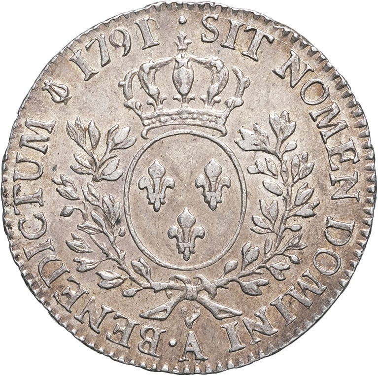 Rv. SIT NOMEN DOMINI BENEDICTUM (différent) (date). Écu de France ovale, couronné, entre deux rameaux d’olivier, (atelier) au-dessous.