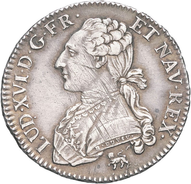 Av. LUD. XVI. D. G. FR. ET NAV. REX. Buste du Roi à gauche, portant une veste brodée, avec l’ordre du Saint-Esprit, les cheveux noués sur la nuque par un ruban. Signature B. DUVIV. F. sur la tranche du buste ; au-dessous, (différent).