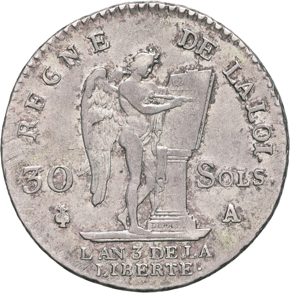 Rv. REGNE DE LA LOI. Le Génie de la France gravant le mot CONSTITUTION (en deux lignes) sur une table de la loi reposant sur un autel, accosté de 30 et (différent) à gauche, de SOLS et (atelier) à droite. Signature cursive DUPRÉ en creux sur la base de l’autel. À l’exergue : L’AN (date) DE LA LIBERTÉ en deux lignes.