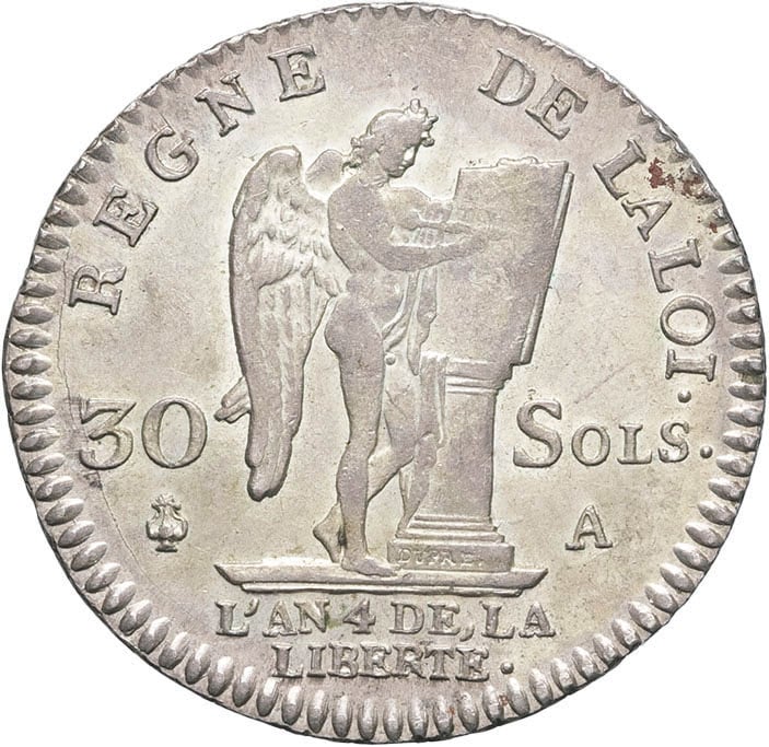 Rv. REGNE DE LA LOI. Le Génie de la France gravant le mot CONSTITUTION (en deux lignes) sur une table de la loi reposant sur un autel, accosté de 30 et (différent) à gauche, de SOLS et (atelier) à droite. Signature cursive DUPRÉ en creux sur la base de l’autel. À l’exergue : L’AN (date) DE LA LIBERTÉ en deux lignes.