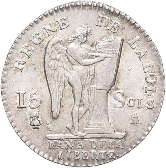 Rv. REGNE DE LA LOI. Le Génie de la France gravant le mot CONSTITUTION (en deux lignes) sur une table de la loi reposant sur un autel, accosté de 15 et (différent) à gauche, de SOLS et (atelier) à droite. À l’exergue : L’AN (date) DE LA LIBERTÉ en deux lignes.