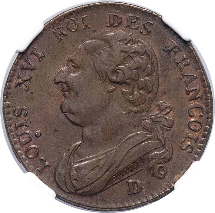 Av. LOUIS XVI ROI DES FRANCOIS. Buste drapé à gauche du Roi, la tête nue, les cheveux noués par un ruban sur la nuque, signature DUVIVIER. Au-dessous (atelier).
