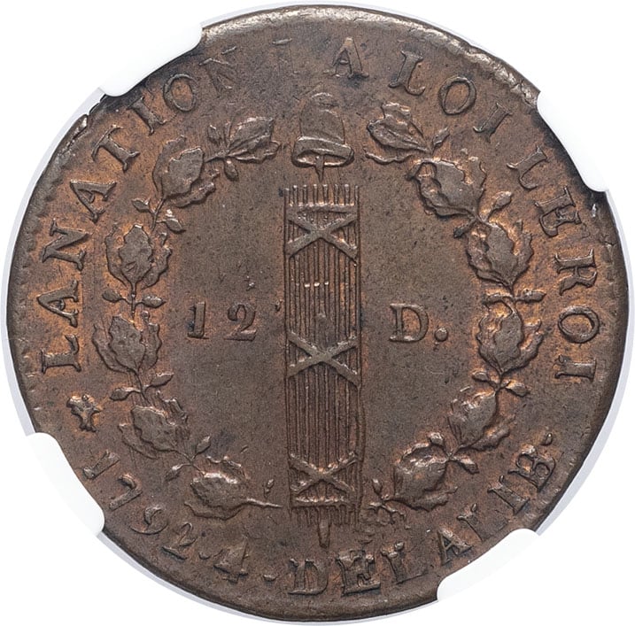 Rv. (différent) LA NATION LA LOI LE ROI. Faisceau sommé d’un bonnet phrygien et accosté de 12 - D, entre deux branches de chêne. À l’exergue : (date). (An). DE LA LIB.