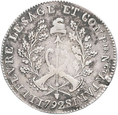 Av. LEFEVRE LE SAGE ET COMPie Ngt A PARIS. La Liberté assise à gauche et appuyée sur une colonne surmonté d’une pique avec bonnet de la Liberté et du livre ouvert des Droits de l’Homme Article V. Derrière elle, une autre colonne surmontée d’un coq ; à l’exergue (date).