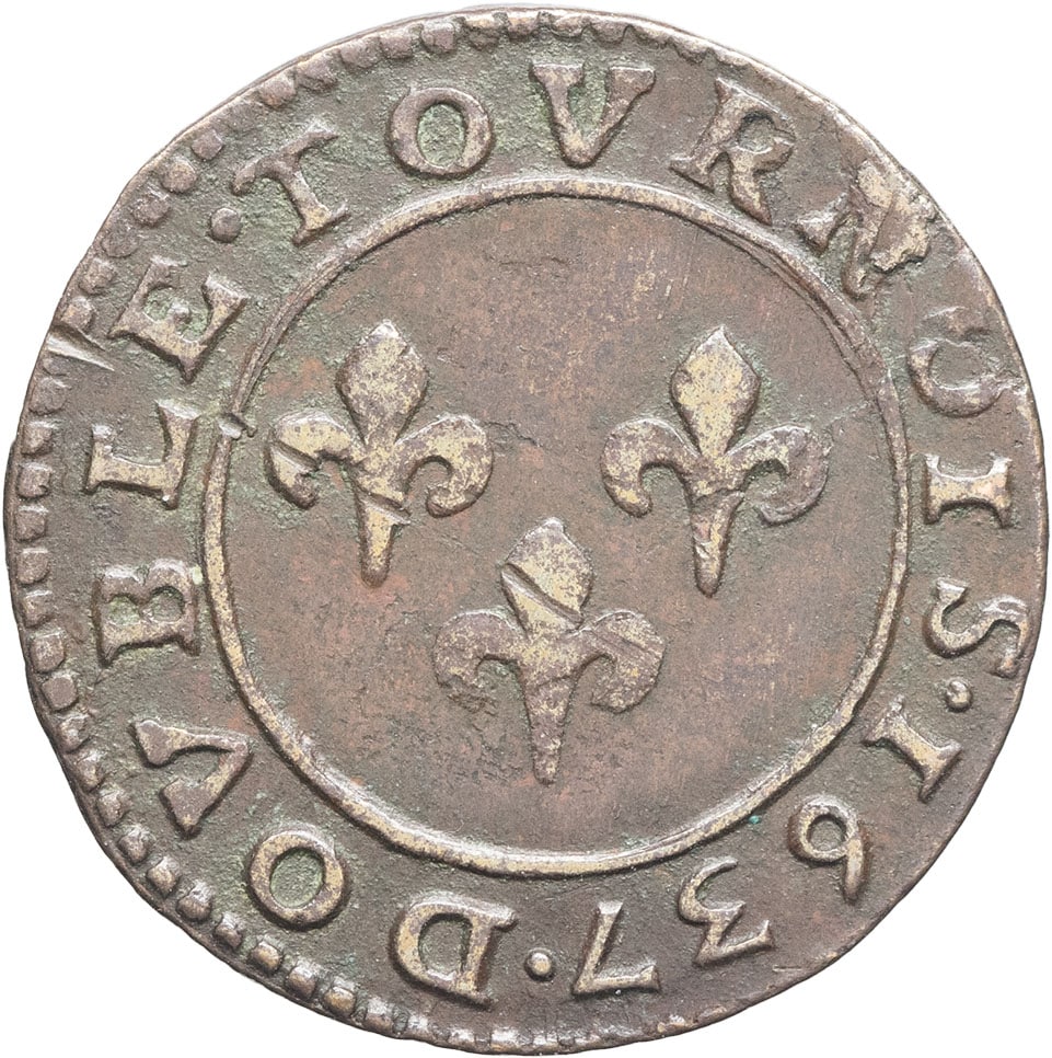 Rv. (à 6 h) DOVBLE. TOVRNOIS. (date). Trois trèfles simulant des lis.