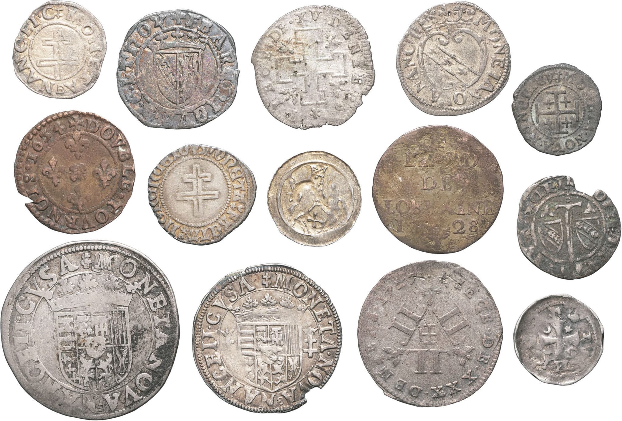 Ensemble principalement composé de monnaies en argent, de Lorraine, Verdun, Metz, etc. Dont plusieurs pfennig bractéates. Le tout accompagné d’une cinquantaine d’étiquettes à la plume ou au crayon. Qualités diverses.