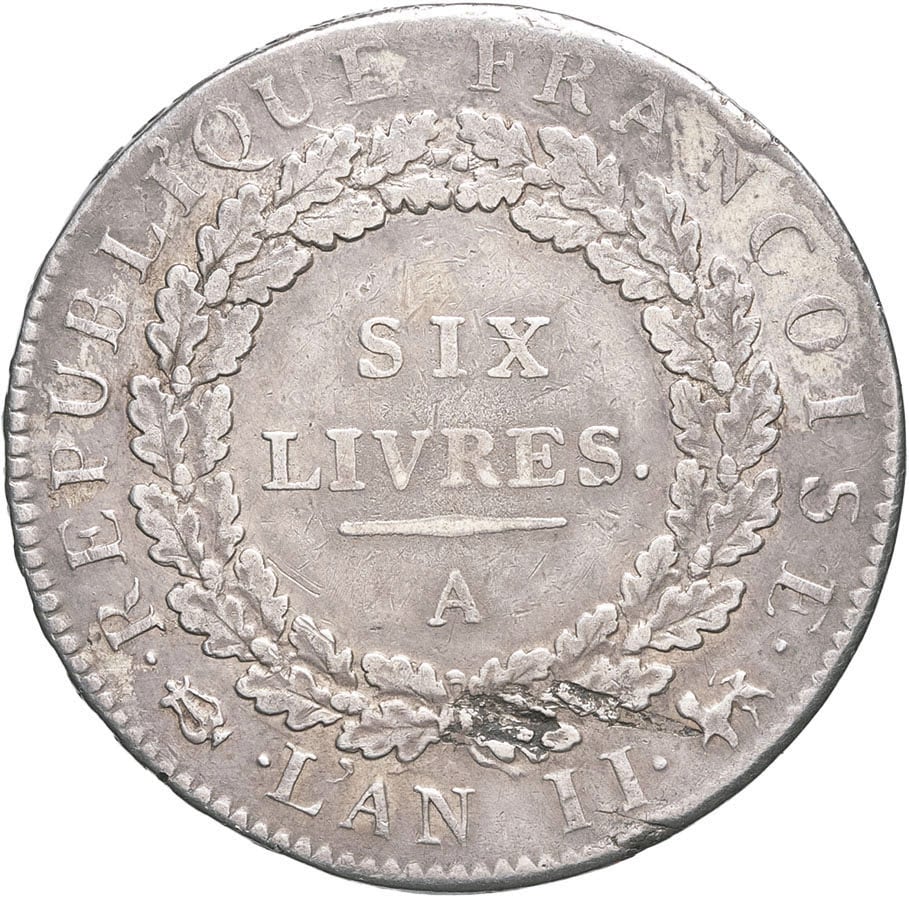 Av. REPUBLIQUE FRANÇOISE/ (différent) L’AN (date) (différent). Dans une couronne formée de deux branches de chêne : SIX LIVRES. et (atelier).