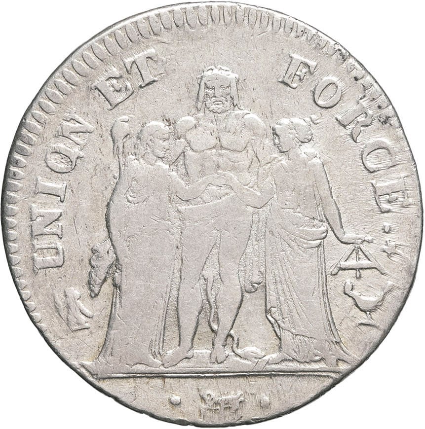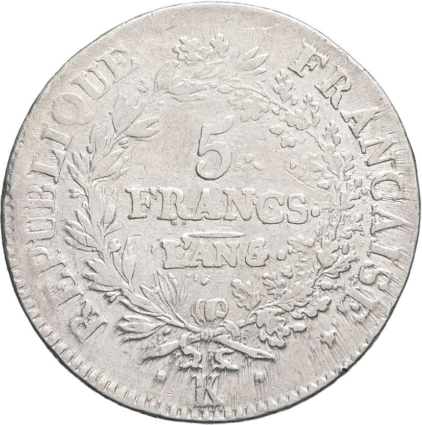 - Directoire (1795-1799). 5 francs Union et Force An 5/4 (1796), K, Bordeaux.