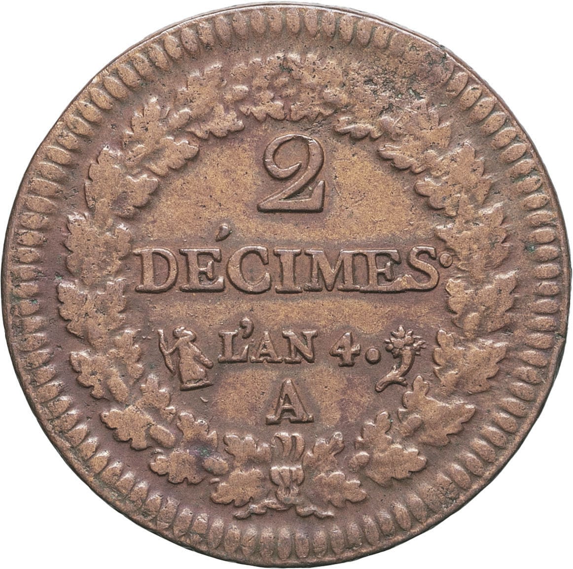 Rv. Dans une couronne formée de deux branches de chêne : 2 DÉCIMES. L’AN (date). (différent) (atelier) (différent).