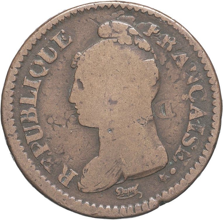 Av. REPUBLIQUE FRANÇAISE. Buste de la République à gauche, coiffée d’un bonnet de la liberté ; au-dessous signature cursive Dupré.