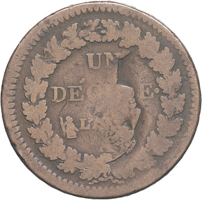 Rv. Dans une couronne formée de deux branches de chêne : UN DÉCIME L’AN (date) et (différent) (atelier) (différent).