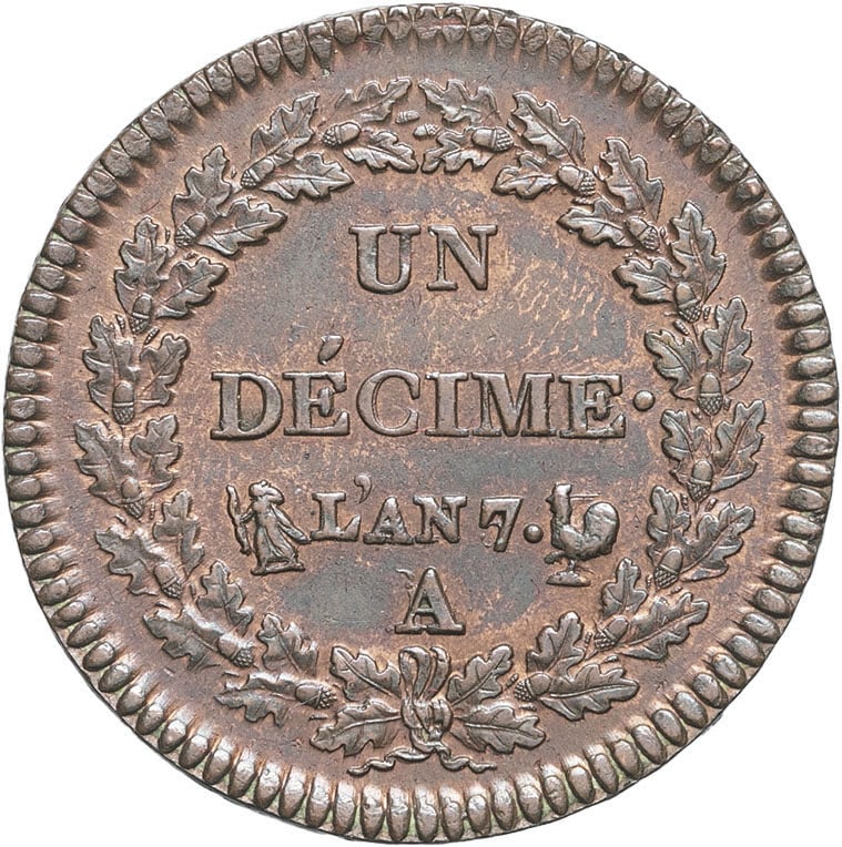 Rv. Dans une couronne de chêne : UN DÉCIME L’AN (date) (atelier).