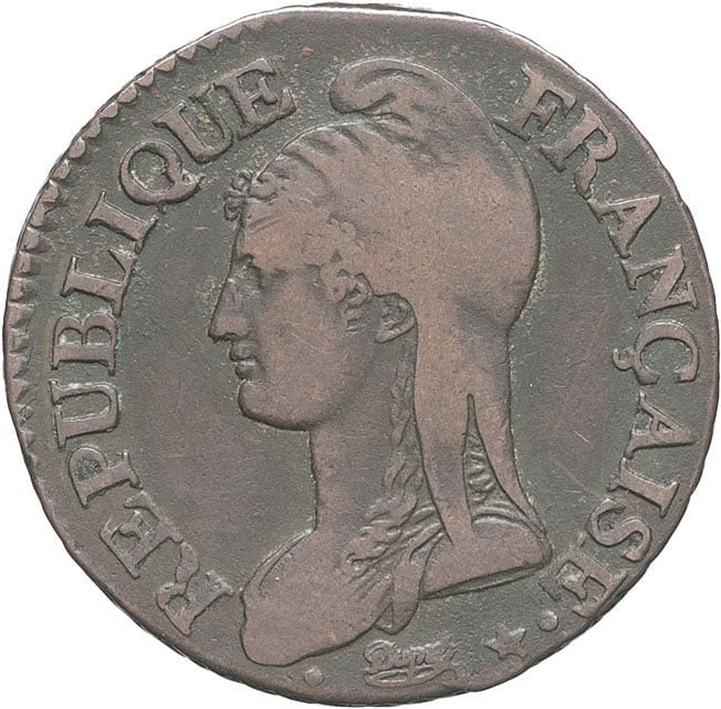 Av. REPUBLIQUE FRANÇAISE. Buste de la République à gauche, coiffée d’un bonnet de la liberté ; au-dessous signature cursive Dupré.
