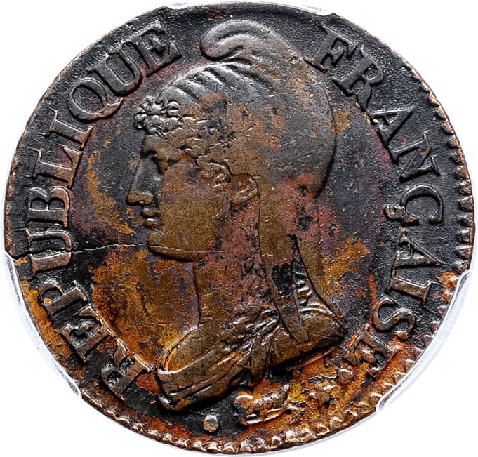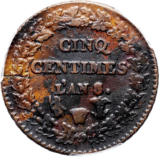 PCGS Genuine Corrosion Remvd - VF Detail (54298448). Millésime 8 repoinçonné sur 5, atelier W repoinçonné sur T et différent caducée repoinçonné sur ancre. Le flan fissuré. TB à TB.
