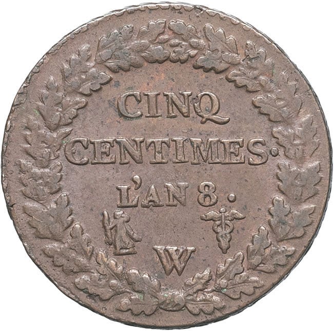 Rv. Dans une couronne formée de deux branches de chêne : CINQ CENTIMES. L’AN (date). (différent) (atelier) (différent).