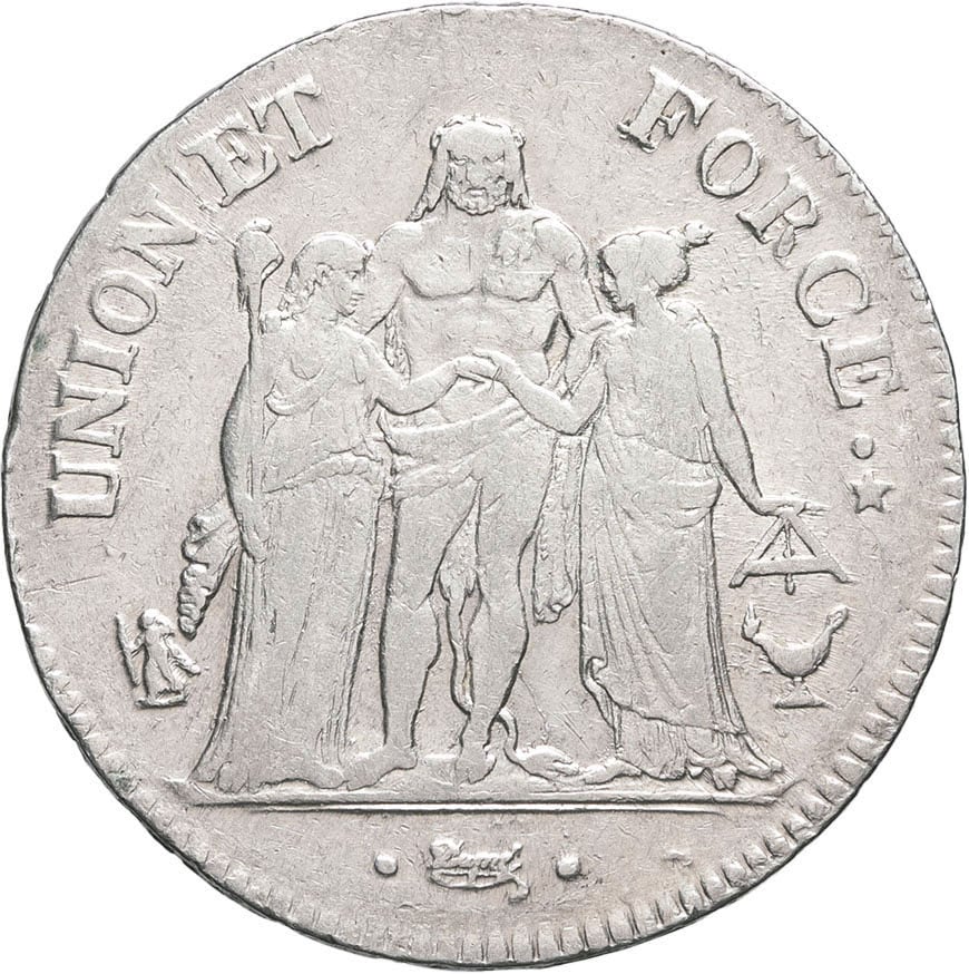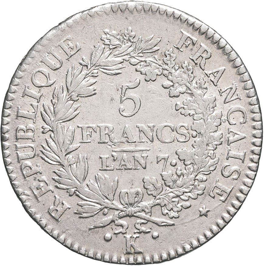 - Consulat (1799-1804). 5 francs Union et Force An 7 (1798), K, Bordeaux.