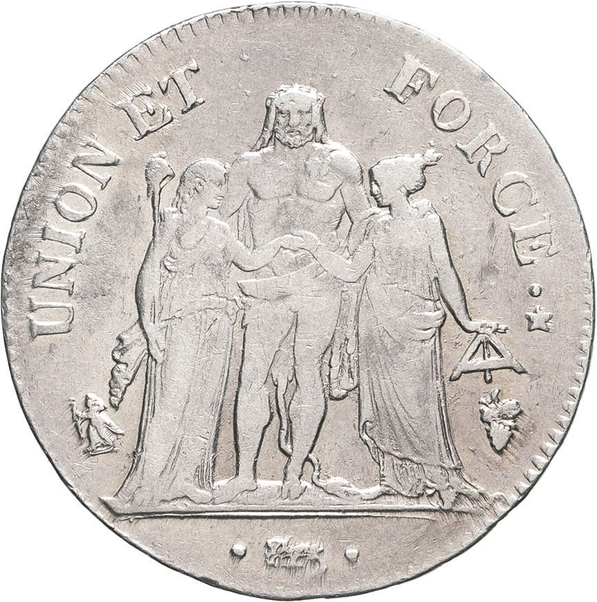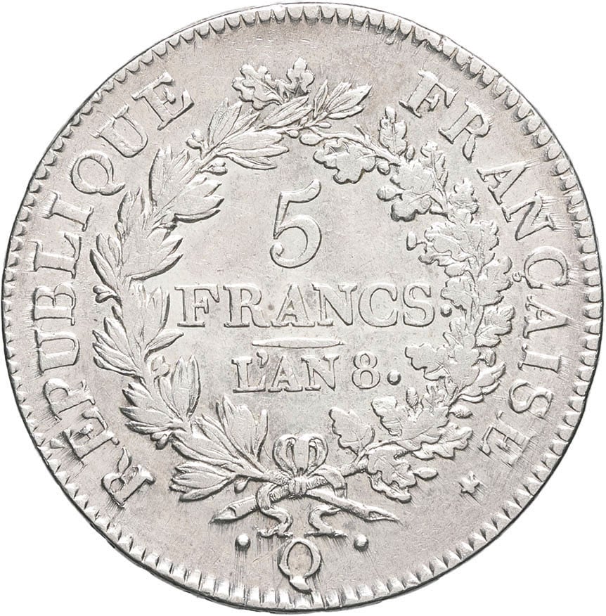 - Consulat (1799-1804). 5 francs Union et Force An 8 (1799), Q, Perpignan.